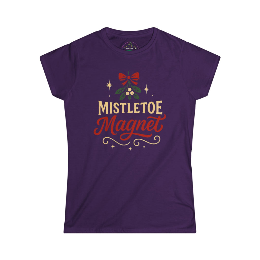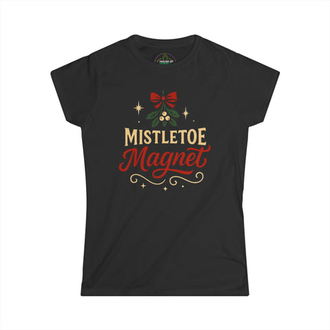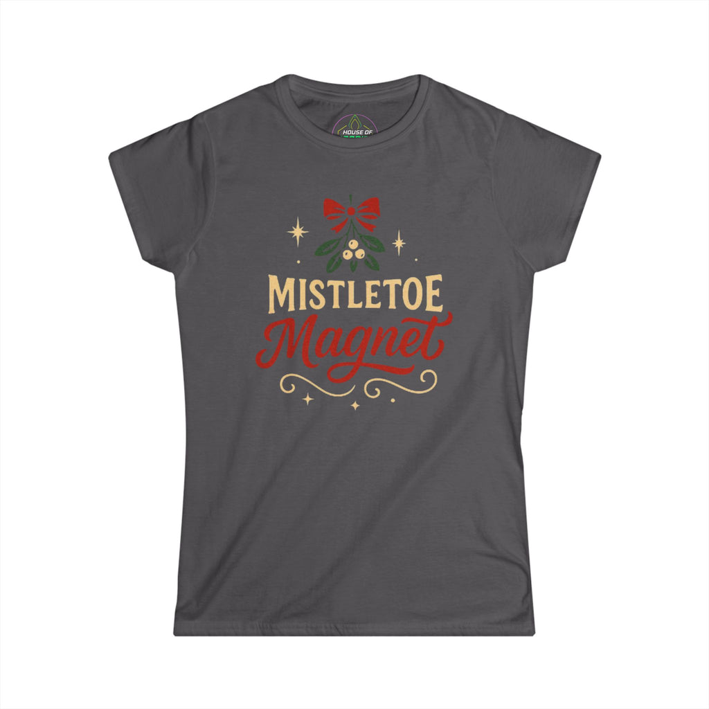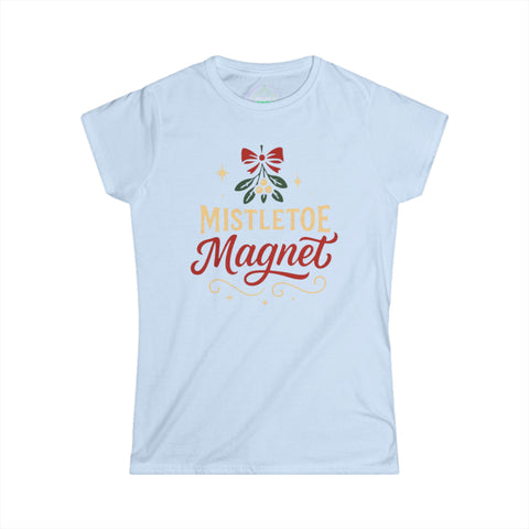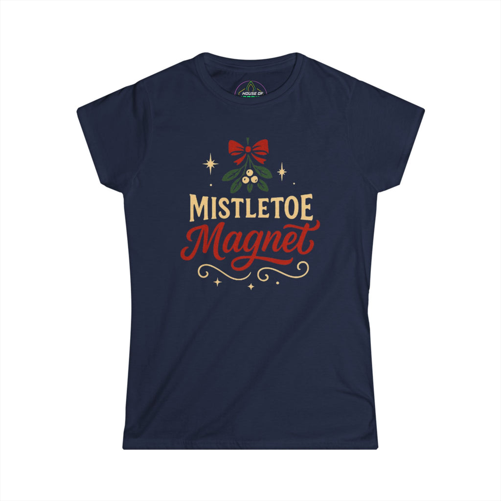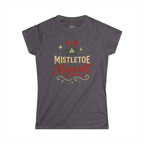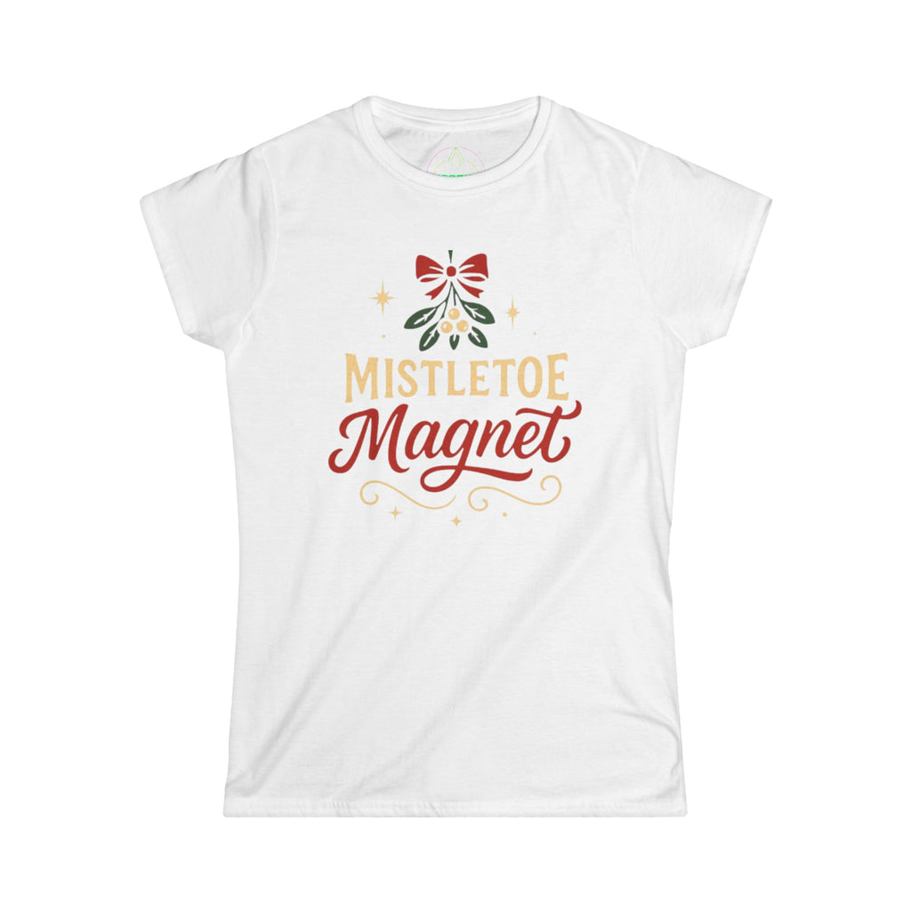 Lighthearted and festive, this women's softstyle tee reads “Mistletoe Magnet” in warm script beneath a charming bow and sprig illustration. The slim, semi-fitted silhouette and lightweight 4.5 oz fabric make it easy to layer under a cardigan or wear on its own at holiday gatherings. Soft ringspun cotton (with fiber blends for heather and sport colors) feels gentle against the skin, while thoughtful construction—ribbed collar, shoulder tape, side seams and double-stitched hems—keeps the tee looking crisp through wear and washes. Wear it to Christmas parties, cozy nights by the fire, or while playing cupid at seasonal get-togethers; the playful design sets a merry tone without shouting for attention.