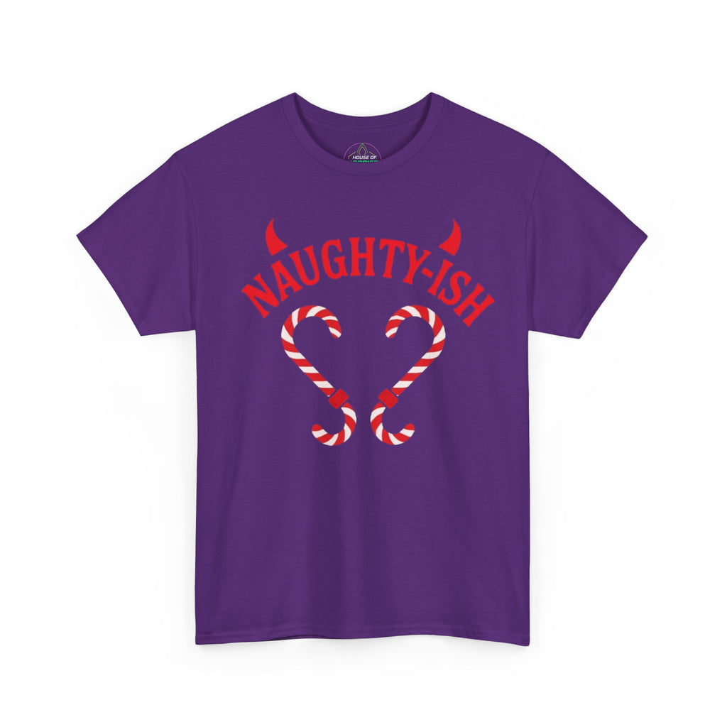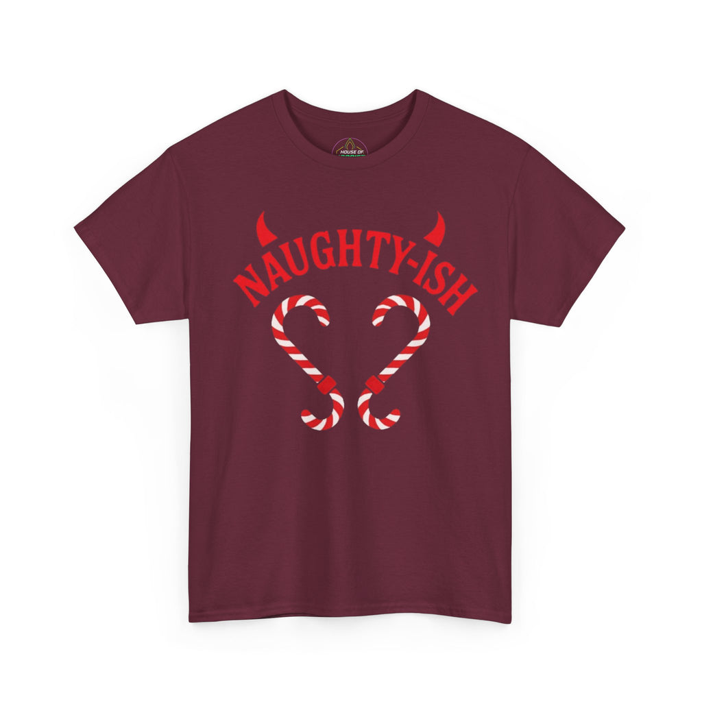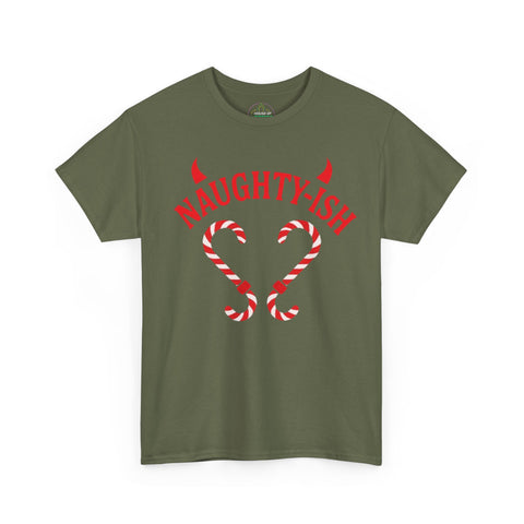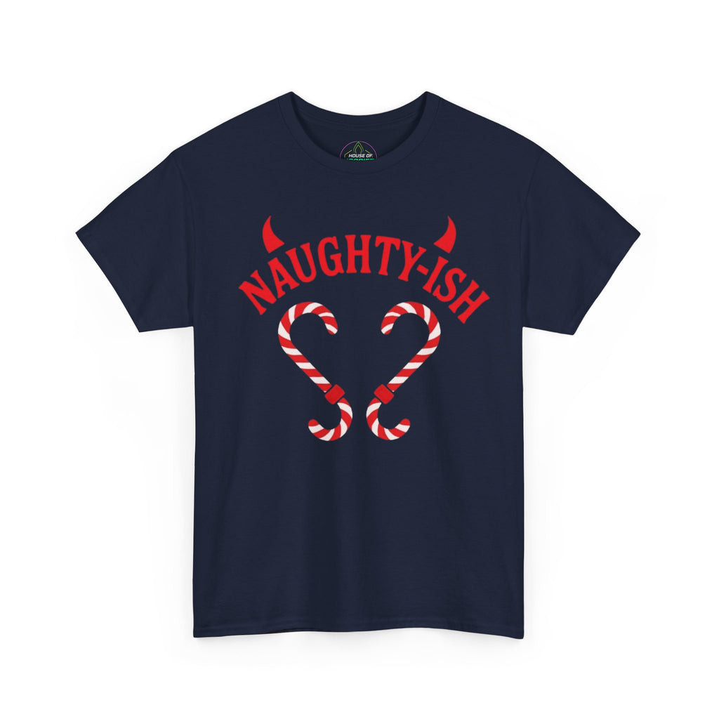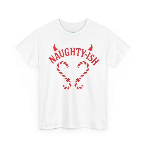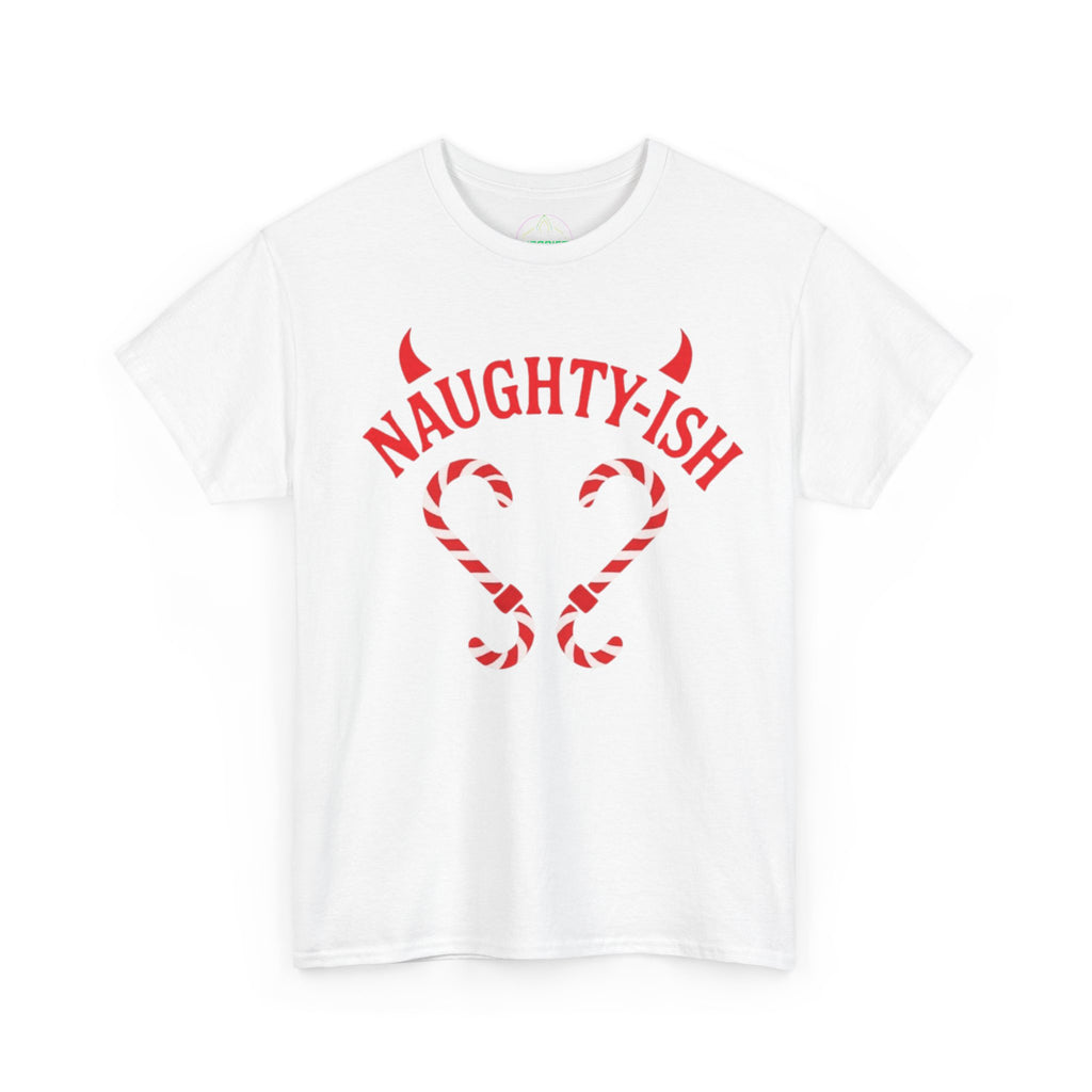 Soft, sturdy, and playfully mischievous — this classic tee slides into holiday rotations with a wink. The front features a bright red “NAUGHTY-ISH” arch above two candy-cane hooks that form a cheeky heart, finished with tiny devil horns for a sly edge. Wear it to fireside cookie swaps, cozy movie nights, or casual winter outings where you want to lean festive but not saccharine. The medium-weight cotton holds prints crisply and keeps its shape through washes, so that cheeky design stays bold year after year. Comfortable, unobtrusive, and just a touch rebellious — it’s for people who like holiday spirit with attitude.