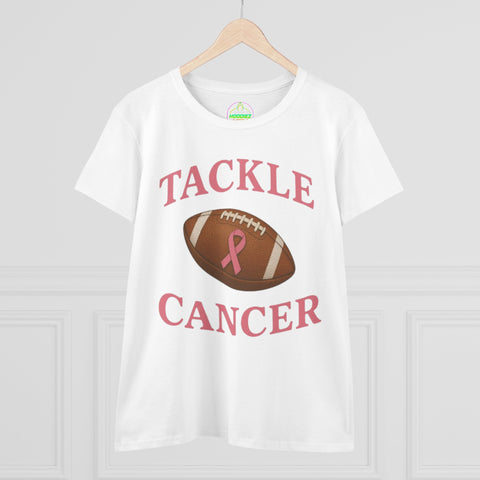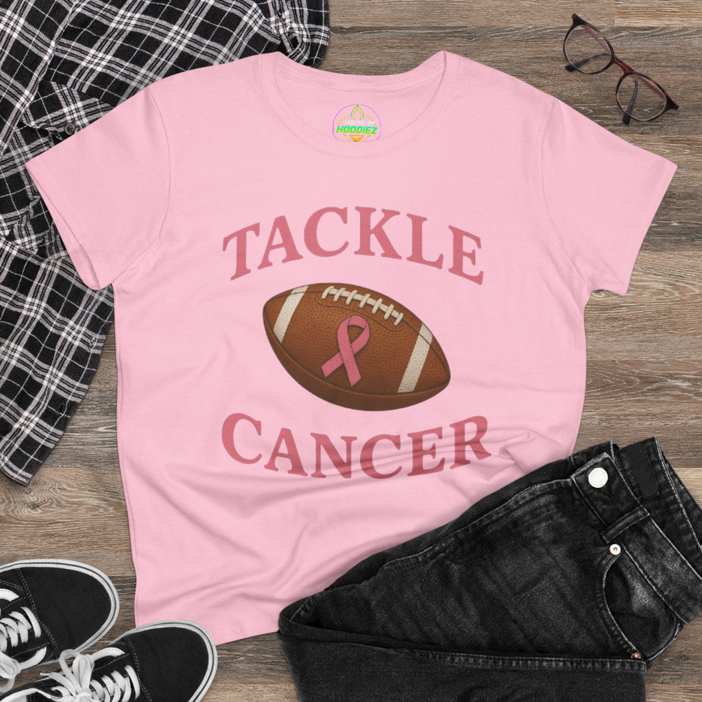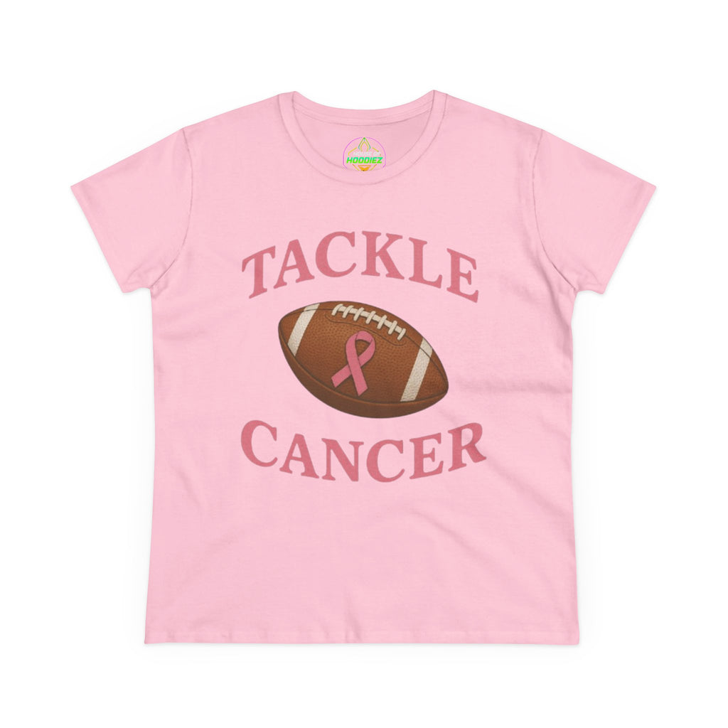 Embrace comfort and style with this Women's Midweight Cotton Tee, designed to uplift and inspire. Featuring a vibrant 'Tackle Cancer' graphic, this tee makes a bold statement while promoting awareness. Made from soft cotton, it provides a cozy fit tailored to keep you feeling good all day. Perfect for casual outings, community events, or even while cheering for your favorite team, this shirt brings people together in the fight against cancer. Ideal for champions of hope—wear it during Breast Cancer Awareness Month, charity events, or simply to show your support. Fashionable yet meaningful, it's the perfect addition to any wardrobe, making it a thoughtful gift for loved ones on special occasions or holidays.