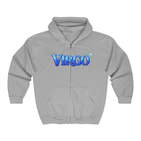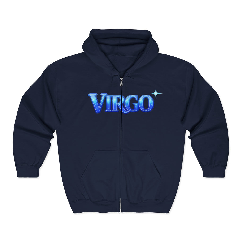 Soft, roomy zip-up hoodie with a bold, glossy "VIRGO" crest across the chest. The design reads like a vintage neon sign — cool blue gradients, subtle highlights, and a tiny star-accent at the end that catches the eye. It layers easily over tees for crisp evenings at the planetarium or long drives under streetlights.